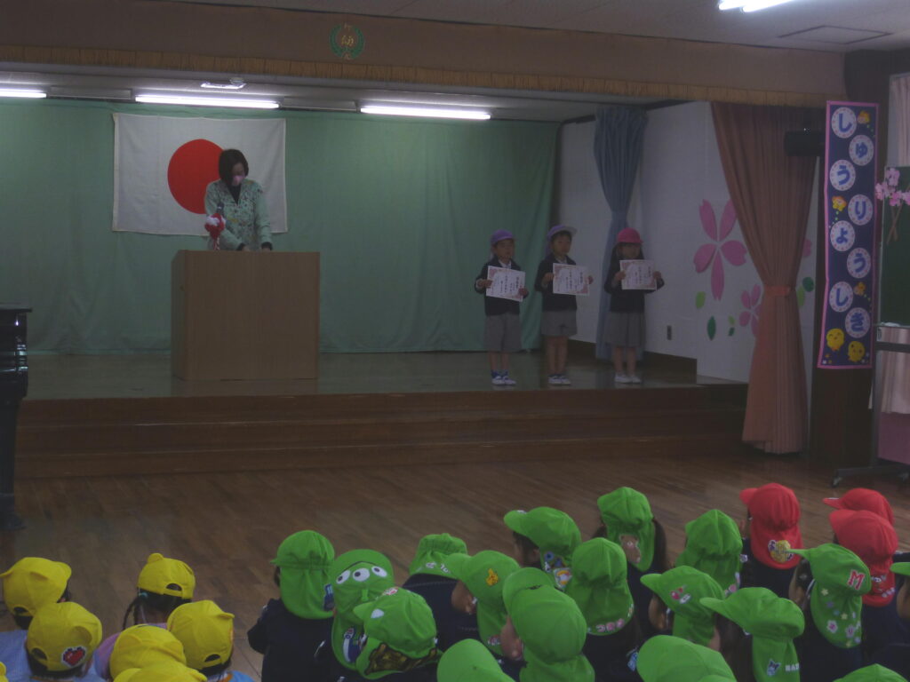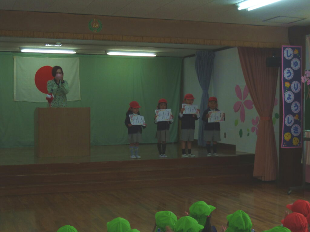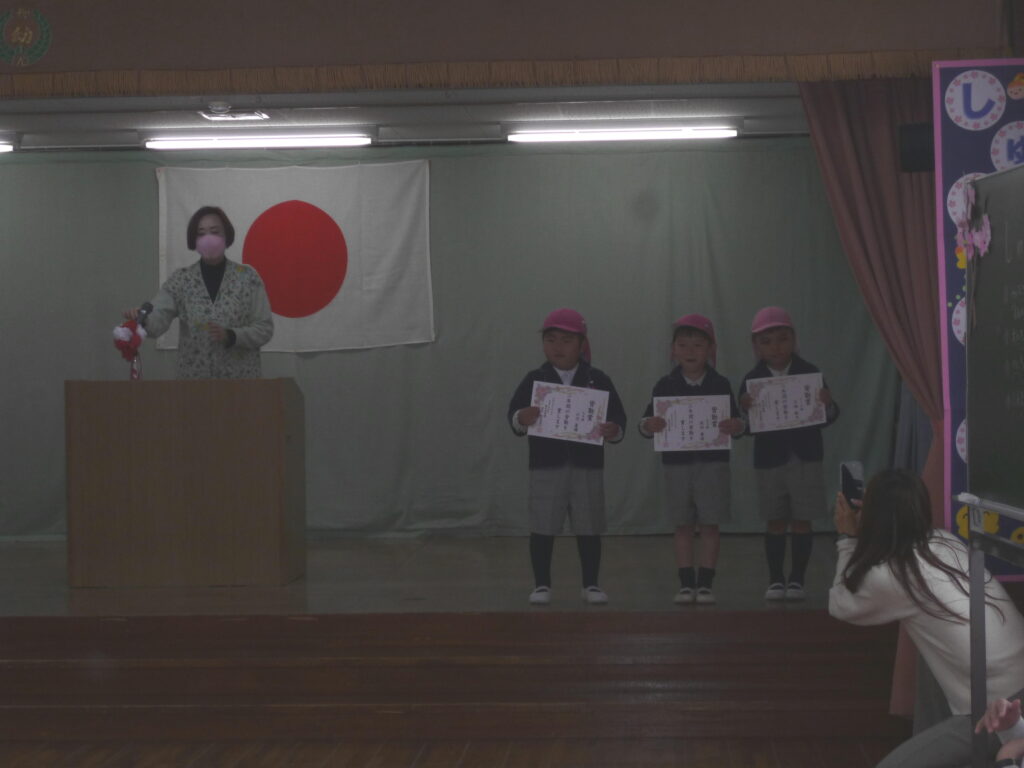 3月19日(木) 修了式を、迎えた年中少ひよこ組。お休みせずに幼稚園に来たお友達の皆勤賞授与、進級したクラスの新しい先生の発表と。